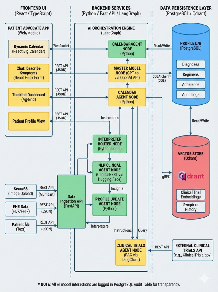 I have the architecture of the System 2 Patient Advocate: a React frontend; Python-LangGraph backend; and a data persistence layer in PostgreSQL / Qdrant. Patient feedback drives a module that can follow and analyze effectiveness of physicians’ treatments and AI models’ suggested regimens.